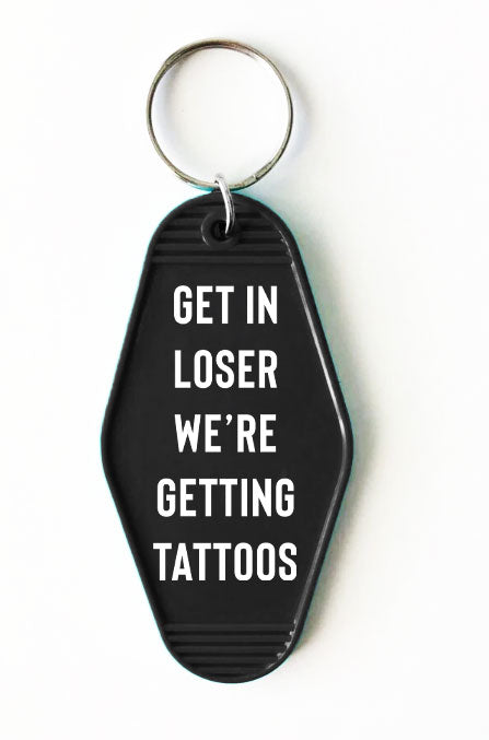 Drive into the shadows with our all-black keychain, featuring double-sided UV-printed white text. Sleek and lightweight, it's the ideal addition to your keychain while seamlessly blending into your essentials. Text states "GET IN LOSER WE'RE GETTING TATTOOS" on both sides.