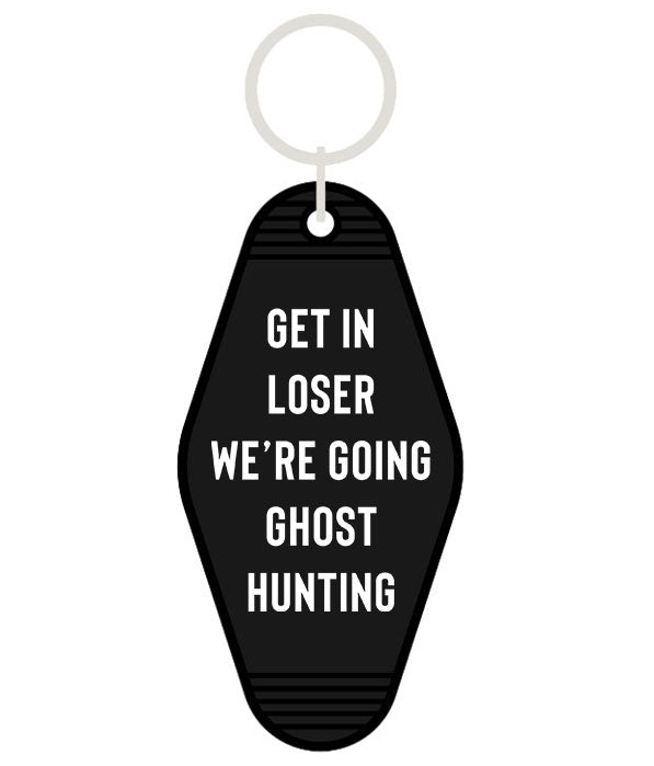 Drive into the shadows with our all-black keychain, featuring double-sided UV-printed white text. Sleek and lightweight, it's the ideal addition to your keychain while seamlessly blending into your essentials. Text states "GET IN LOSER WE'RE GOING GHOST HUNTING" on both sides.