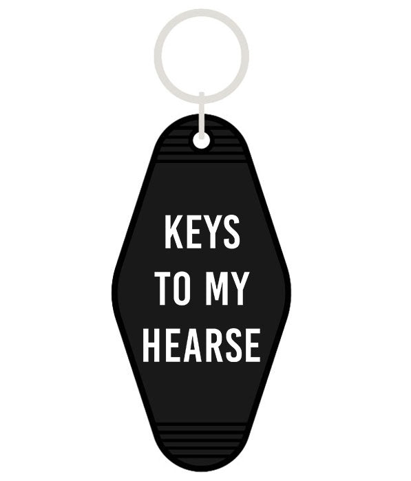 Drive into the shadows with our all-black keychain, featuring double-sided UV-printed white text. Sleek and lightweight, it's the ideal addition to your keychain while seamlessly blending into your essentials. Text states "KEYS TO MY HEARSE" on both sides.
