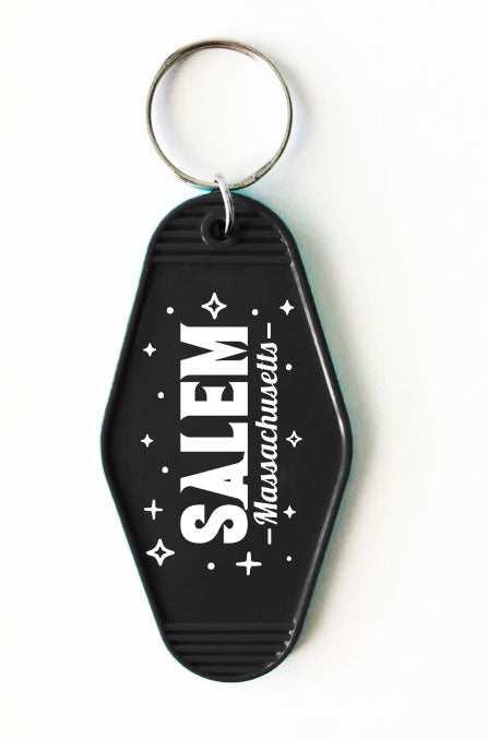 Drive into the shadows with our all-black keychain, featuring double-sided UV-printed white text. Sleek and lightweight, it's the ideal addition to your keychain while seamlessly blending into your essentials. Text states "SALEM MASSACHUSETTS" on both sides.