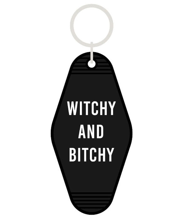 Drive into the shadows with our all-black keychain, featuring double-sided UV-printed white text. Sleek and lightweight, it's the ideal addition to your keychain while seamlessly blending into your essentials. Text states "WITCHY AND BITCHY" on both sides.
