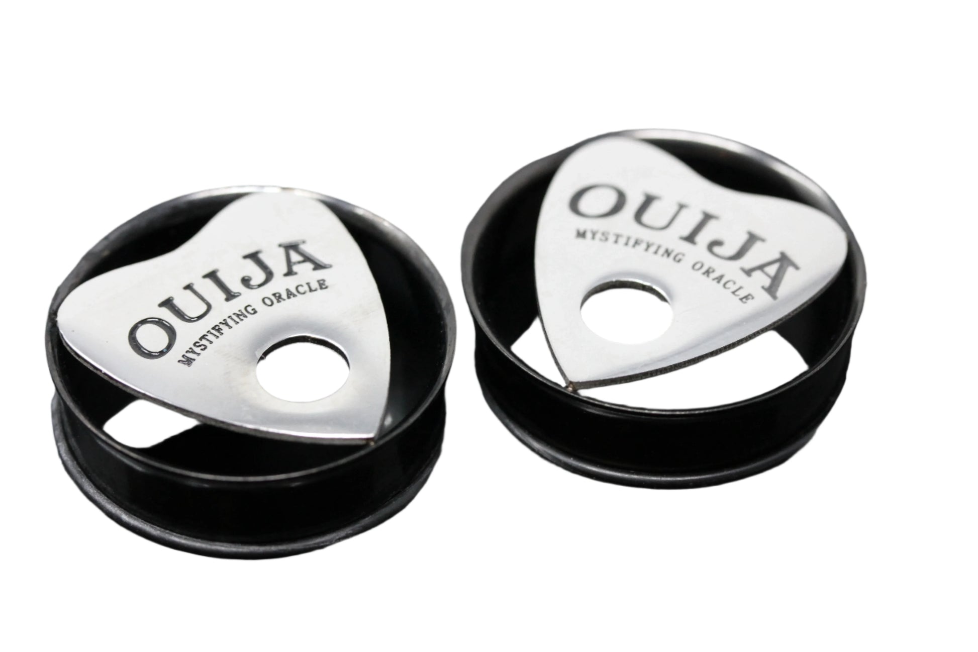Speak to the style spirits with these hauntingly detailed tunnel plugs, featuring a cut-out Ouija board planchette design. Crafted from stainless steel with an open center and finished with a secure O-ring backing, these plugs stay comfortably in place while making a supernatural statement. Perfect for occult lovers, mystic vibes, and those who like their accessories with a little afterlife energy.