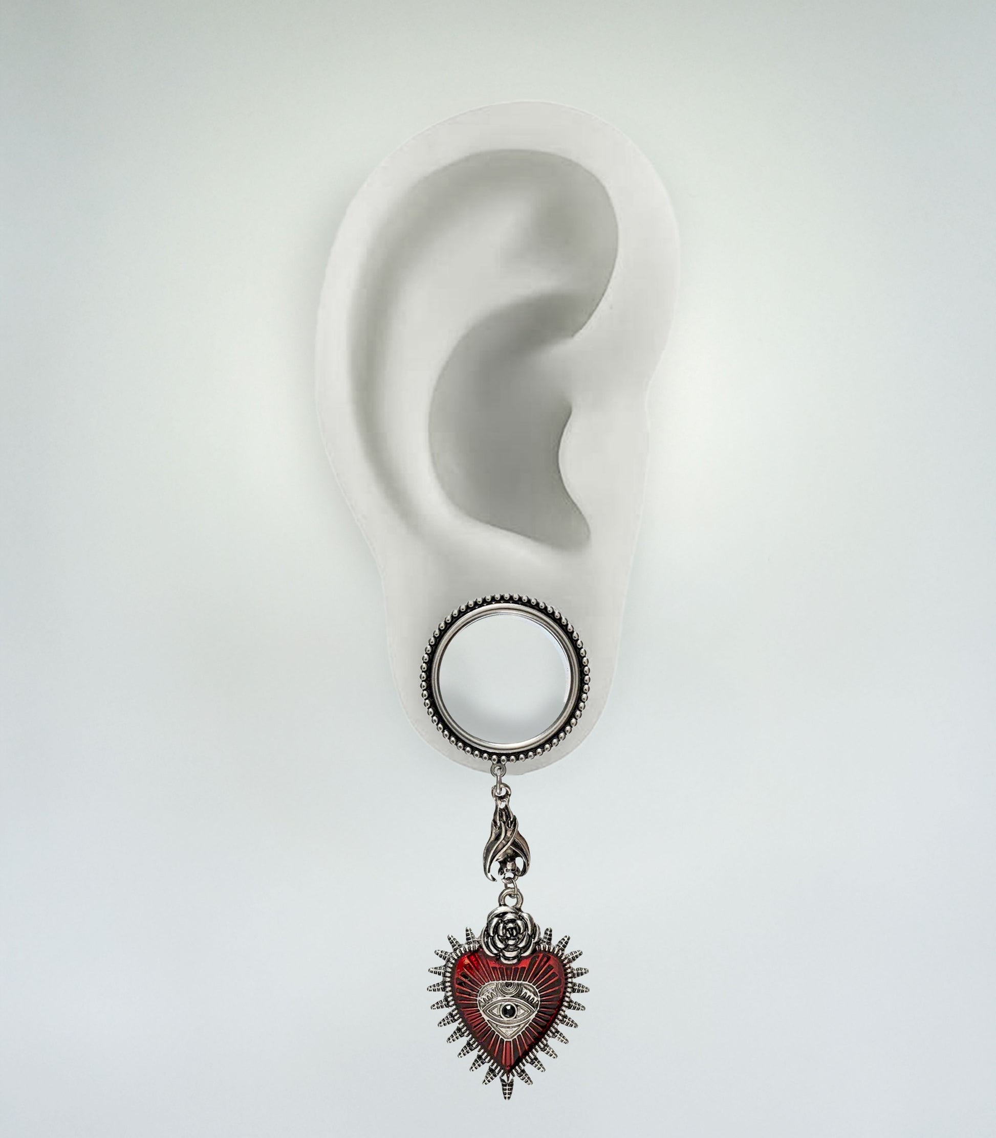 The Watchful Heart surgical steel tunnels combine durability with delicate style, featuring charming dangling hearts built directly into the tunnel. This design offers a great alternative to traditional earrings, providing a unique and comfortable way to express your individuality. Perfect for those seeking a standout accessory that’s both elegant and long-lasting.