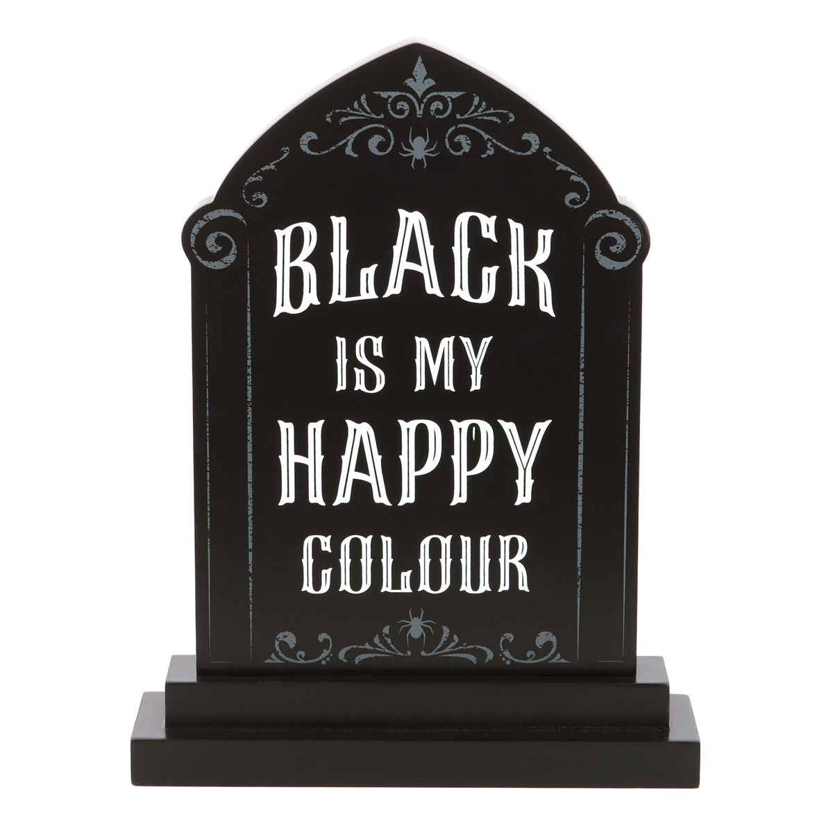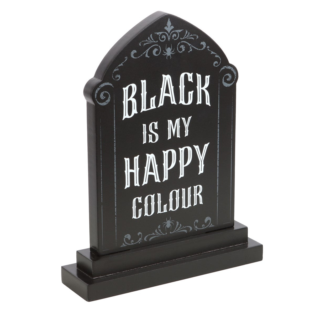 Embrace the darker side of decor with this gothic-style tombstone sign. Evoking images of a fog-shrouded graveyard, it adds a mysterious and eerie touch to any space. Featuring the statement "Black is My Happy Colour," this sign is a must-have for enthusiasts of all things dark and spooky.